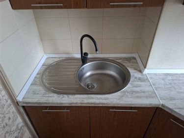 Подгоним под размер, сделаем выпилы под коммуникации и установим столешницу. Наклеим кромки. Работа займёт 2–4 часа. Будет шумно.