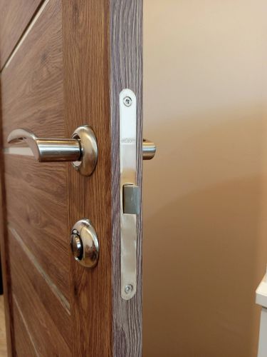 Сделаем торцевое отверстие, установим в него замок и закроем декоративной планкой. Установим ручки с обеих сторон двери. Врежем в коробку ответную часть замка. Работа займёт 30–60 мин. Будет шумно.